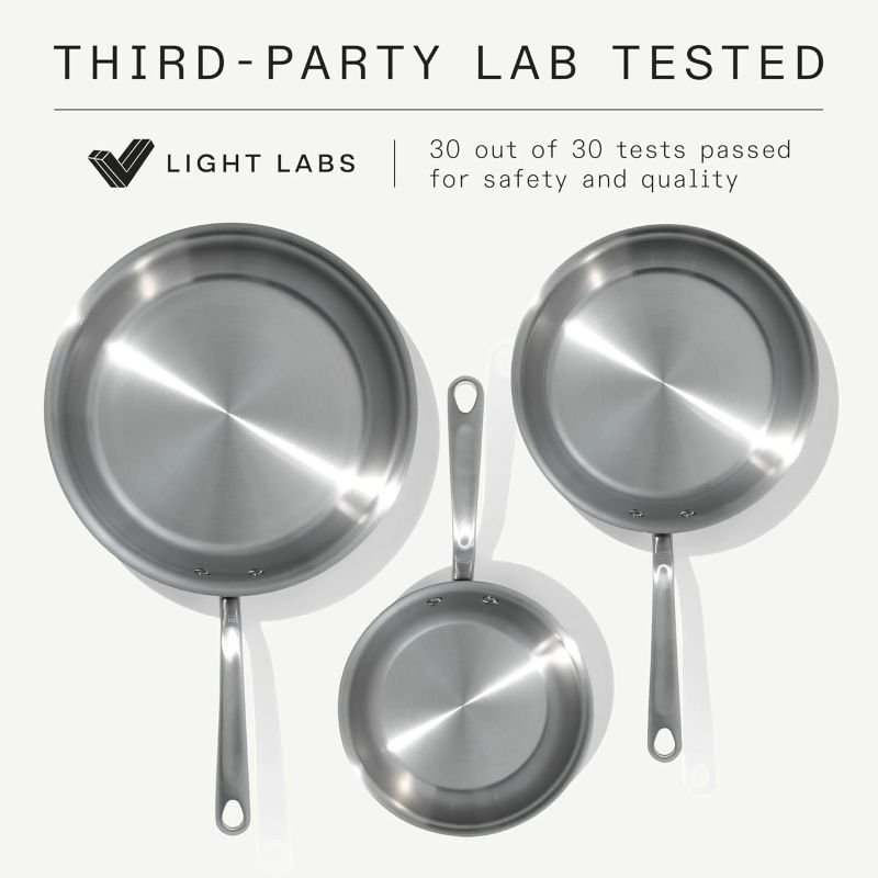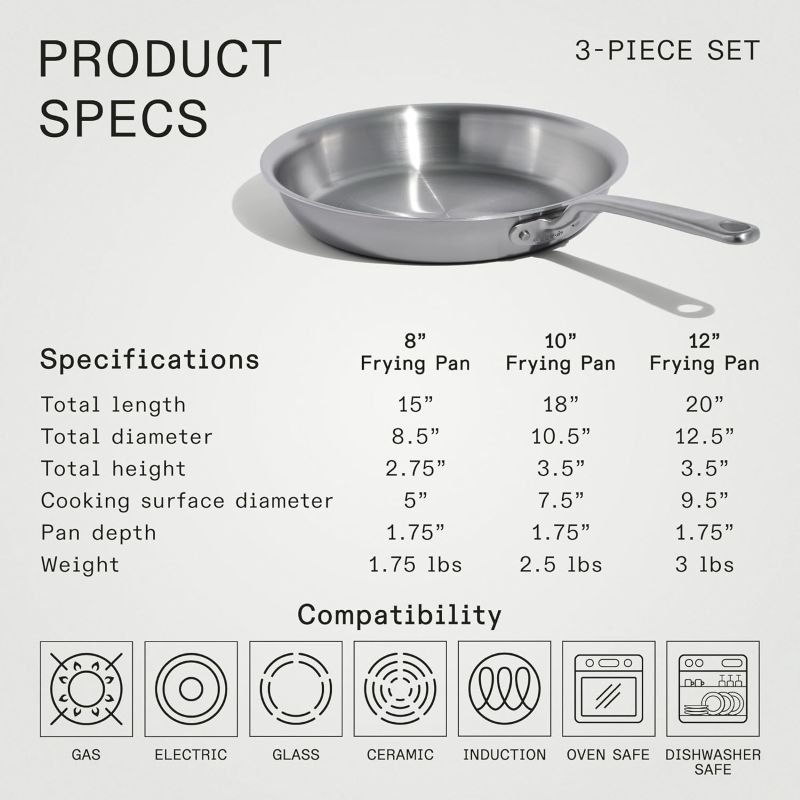 The Made In 3-Piece Stainless Steel Frying Pan Set combines 8, 10, and 12 inch stainless clad pans to cover everything from quick egg dishes to searing steaks and finishing sauces. Each pan is built from 5 layers of premium metal for superior heat distribution, responsiveness, and stability on gas, electric, ceramic, and induction cooktops. A riveted stay-cool handle keeps grip comfortable while the oven-safe construction lets you move seamlessly from stovetop to oven for restaurant-quality results at home. Crafted in Italy and backed by a small business brand, this set is designed for professional performance, durability, and everyday versatility in modern kitchens.