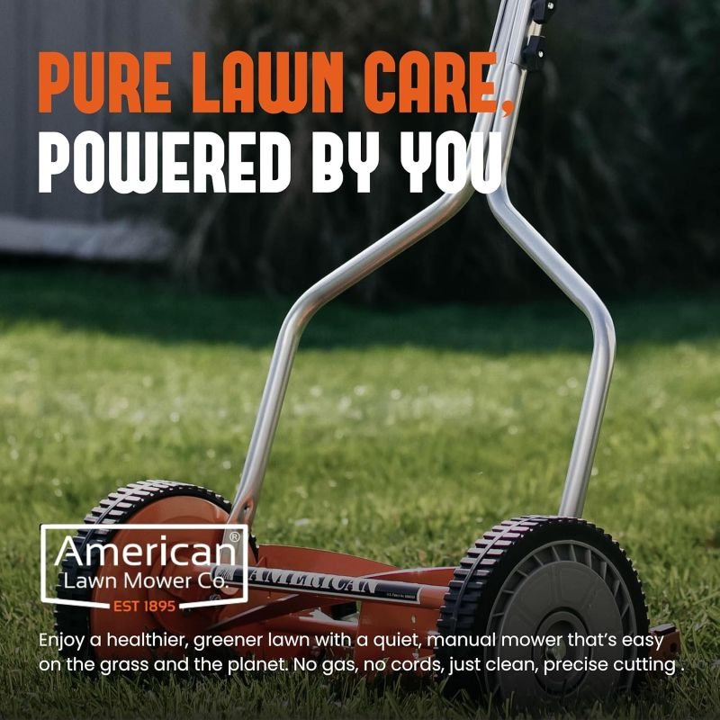The American Lawn Mower Company 1204-14 14-Inch 4-Blade Push Reel Lawn Mower is a manual mower built for homeowners who want a clean, quiet, and eco-friendly way to maintain small to medium lawns. Featuring a 14-inch cutting width, 4 heat-treated alloy steel blades, and 8.5-inch polymer wheels, this reel mower delivers a precise, scissor-like cut that helps keep grass healthier and greener compared to rotary shredding. The adjustable blade height ranges from 0.5 to 1.75 inches, allowing you to customize your lawn finish while effectively cutting grass up to 4 inches tall with multiple passes when needed. Weighing only about 19–20 pounds and operating entirely manually, this mower is easy to push, maneuver, and store, making it ideal for compact yards, narrow passages, and users who prefer low-maintenance equipment. Because it is powered by your own effort rather than gas or electricity, the 1204-14 produces no emissions, no engine noise, and requires minimal upkeep, typically only blade sharpening every few years. Its cushioned T-handle and simple, tool-free assembly add to user comfort and convenience, while the durable construction from alloy steel ensures long-term reliability season after season. As a greener alternative to gas-powered models, this push reel mower is especially well-suited to cool-season grasses and flat lawns where a consistent, well-groomed finish is a priority. With over 20,000 customer ratings and a strong average review score, the American Lawn Mower Company 1204-14 stands out as a proven, budget-friendly solution for sustainable lawn care.