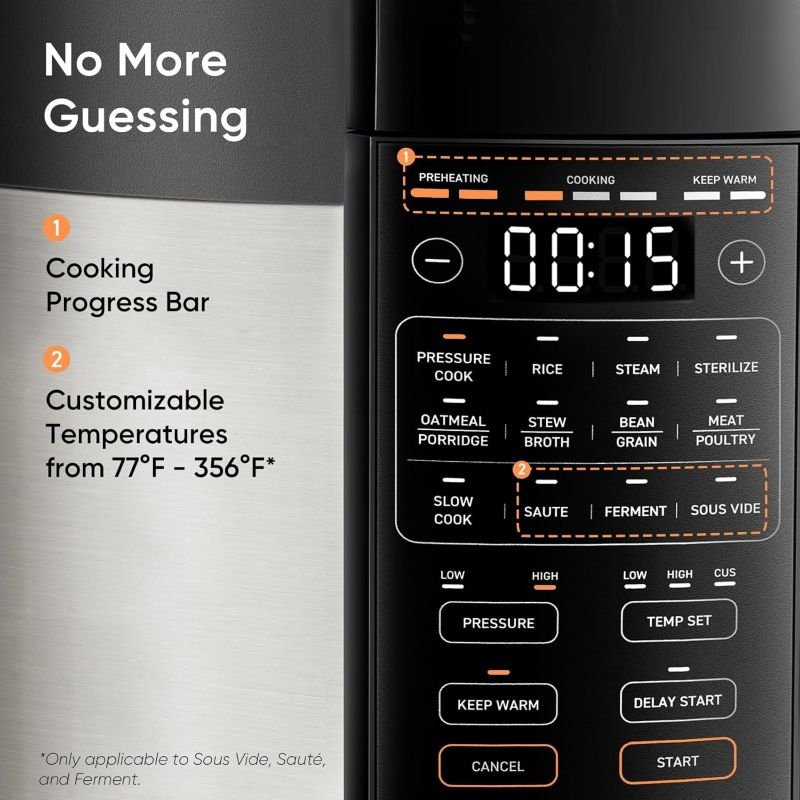 - 𝟵 𝗠𝗮𝗰𝗵𝗶𝗻𝗲𝘀 𝗶𝗻 𝟭: Pressure Cook, Rice, Steam, Sterilize, Oatmeal/Porridge, Stew/Broth, Bean/Grain, Meat/Poultry, Slow Cook, Sauté, Ferment, Sous Vide, Keep Warm