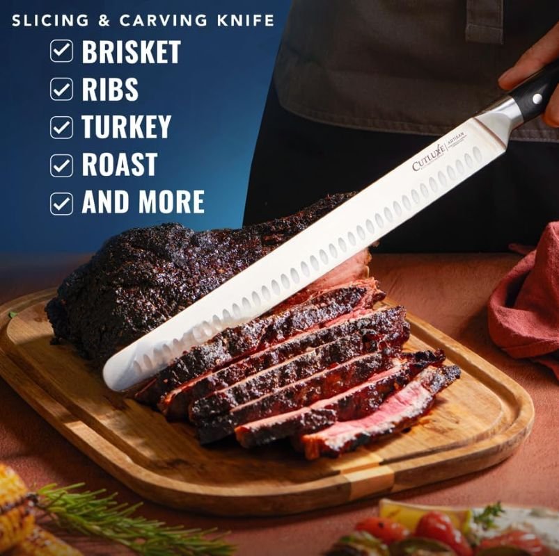 This 12" Cutluxe Brisket Knife features a razor‑sharp, high‑carbon German steel blade with a Granton edge for smooth, tear‑free slices of brisket, turkey, roasts and BBQ meats. Its full‑tang, triple‑riveted pakkawood handle ensures a secure, ergonomic grip, while the included sheath keeps the knife protected between uses. Upgrade your carving setup with a professional‑grade slicing knife designed for serious home cooks and grill enthusiasts . click to see today’s price and availability.