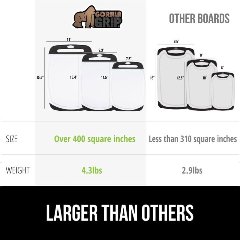 The Gorilla Grip BPA-free reversible cutting board set includes three generously sized, nonporous boards designed to handle daily chopping, slicing, and carving without splintering or peeling. Deep juice grooves catch messy liquids, while slip-resistant rubber borders help keep the boards steady during prep, and the dishwasher-safe surface resists stains and odors. Ideal for meat, vegetables, bread, and more . click to see why this top-rated set is a bestseller in cutting board sets.