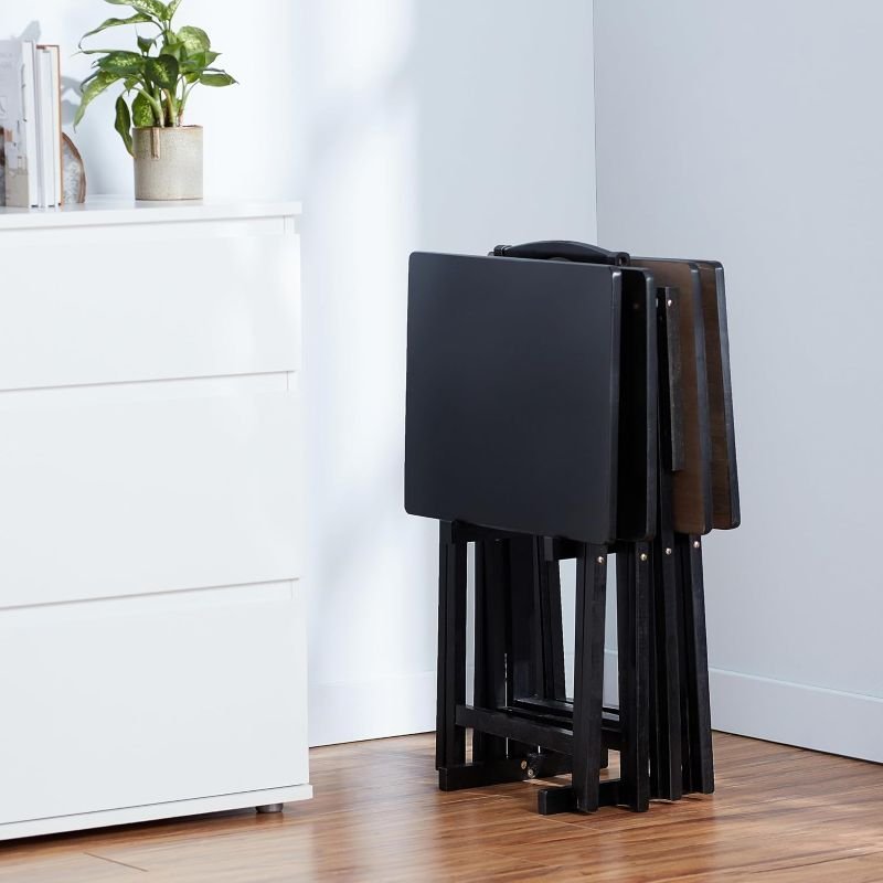 This Amazon Basics 4-pack of portable TV dinner tray tables provides a sturdy wood surface for meals, laptops, or hobbies, supported by a classic foldable design in sleek black. Each 15" x 19" x 26" table folds flat and stores neatly in the included matching rack, saving space while keeping surfaces close at hand. Ideal for living rooms, small apartments, or guest use . click to discover how this practical tray table set can streamline your daily routine.