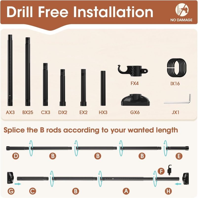 • Adjustable Height & Width: The adjustable height ranges from 4FT to 10FT, and the adjustable width ranges from 28 “to 114”. Extension rods are available for both vertical rods and horizontal curtain rods, there is +/- 14.2″ by splicing sectional rod B. You can adjust the size by the number of extension rods and spring buckles.