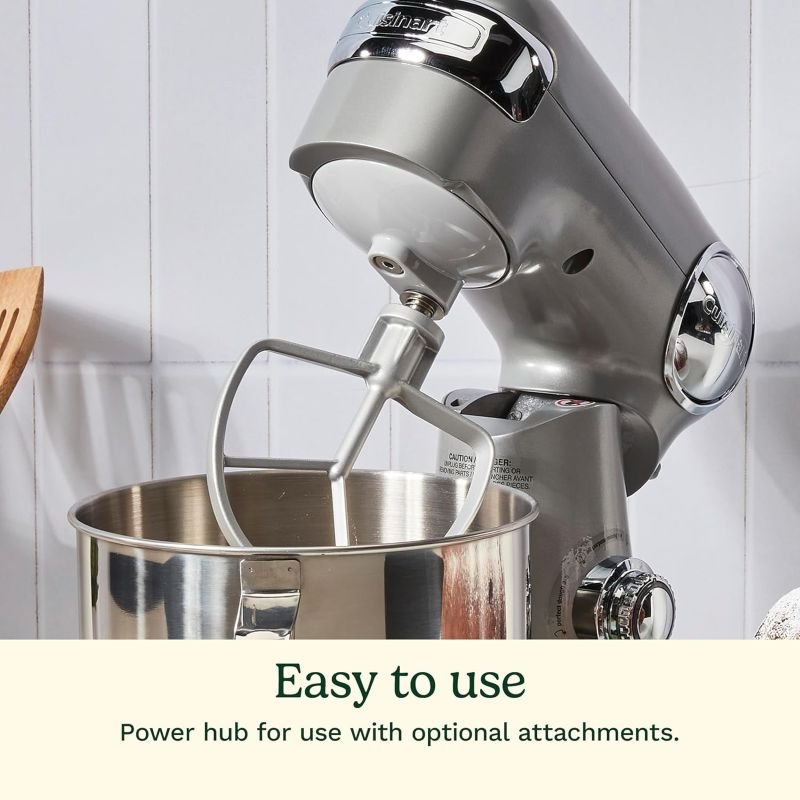 The Cuisinart SM-50BC 5.5-Quart Stand Mixer combines a robust 500-watt motor with die-cast metal construction to deliver reliable power, precision, and performance for everyday baking. Its large 5.5-quart polished stainless steel bowl and 12 speeds give home bakers excellent control for whipping, mixing, and kneading everything from light batters to dense bread dough. A convenient tilt-back head and knob-style controls make this stand mixer easy to operate, while the included chef’s whisk, flat mixing paddle, dough hook, and splash guard with pour spout streamline prep and help keep countertops clean. Designed for flexibility, the SM-50BC is compatible with optional attachments such as a pasta roller, pasta extruder, meat grinder, ice cream maker, and spiralizer, turning it into a multi-purpose kitchen workstation. With its compact 7.87″D x 14.17″W x 14.13″H footprint, 17-pound all-metal build, and dishwasher-safe bowl and accessories, this Cuisinart stand mixer offers durable construction, easy cleanup, and dependable performance in a stylish Silver Lining finish. Backed by a limited 3-year warranty and boasting a 4.7 out of 5-star rating from over 9,900 users, it is a highly rated alternative to more expensive competitors for serious home cooks and bakers.