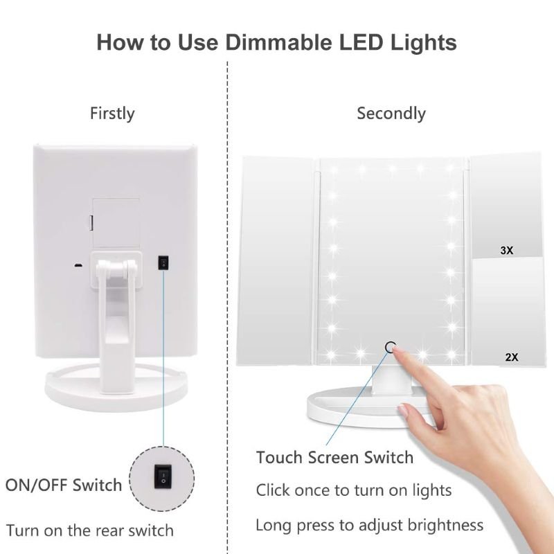 • 180 degree rotation & Tri-fold: The light-emitting makeup mirror on the worktable can be easily adjusted, and the viewing angle can be fixed perfectly and comfortably. Tri-Fold Design :Easy for take away and daily maintenance, can open or fold it like a book when not using to protect it away from the dust or other scratches.The tri-fold and detachable design allows you to take it with you and enjoy delicate makeup anytime, anywhere