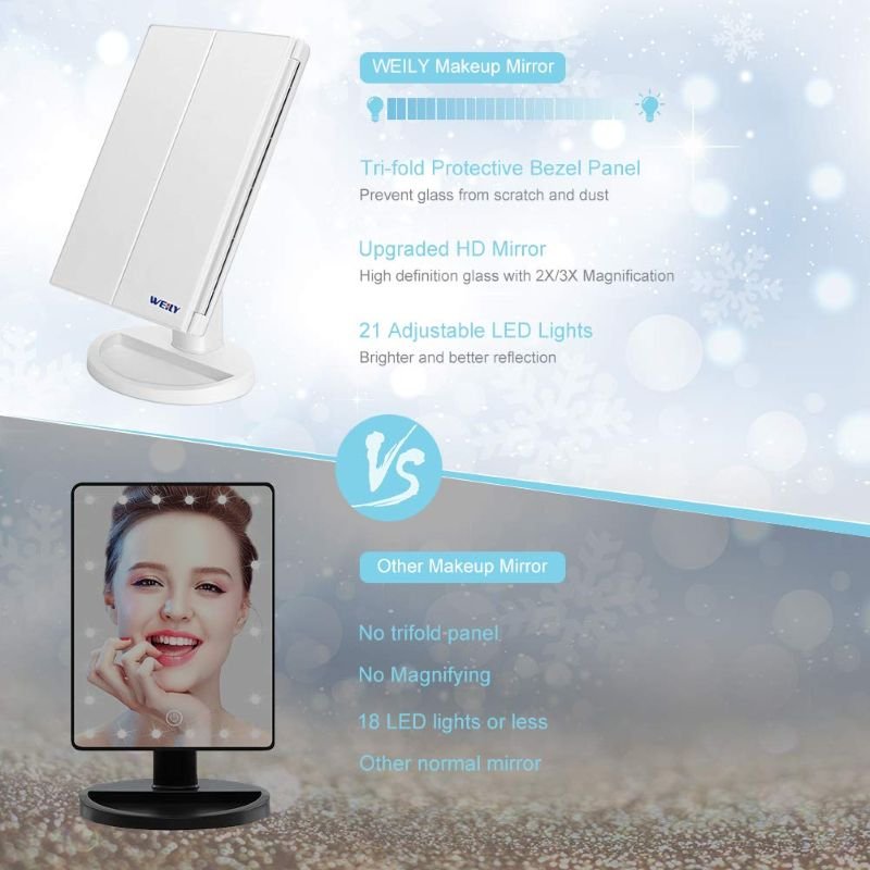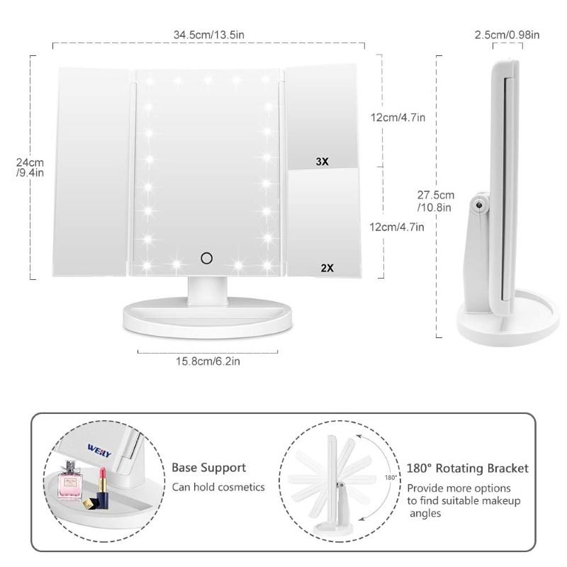 The WEILY Makeup Mirror with 21 LED Lights is a tri-fold vanity mirror designed to deliver clear, detailed makeup application with 1x/2x/3x magnification and adjustable brightness. Its 180° rotating design, dual power supply (USB or 4 AAA batteries), and durable ABS frame make it a practical choice for bedroom, dressing table, or travel use. Built-in storage on the base keeps jewelry and daily cosmetics within easy reach, helping users achieve flawless makeup in any lighting.