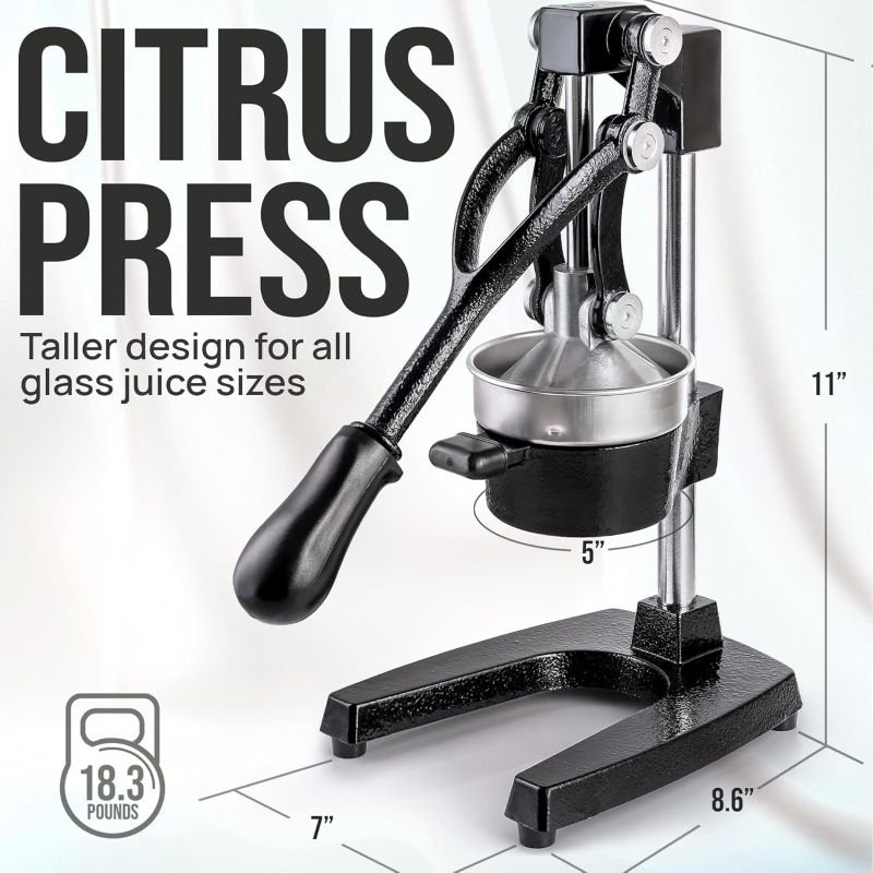 • STURDY AND DURABLE MATERIAL: This manual juicer is made of heavy-duty cast iron that can easily withstand the pressure from continuous pressing for years to come. The leverage mechanism allows a one-time easy pull to get all the juice out. Our citrus press is designed with a heavy rubberized base to firmly keep it in place without the fear of falling, tipping, or sliding off the counter. This hand juicer is great for both professional and at-home use.